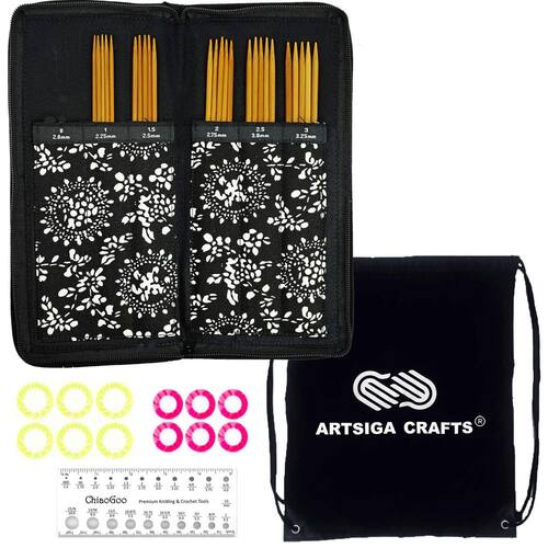 Inclui 1 conjunto de agulhas de tricô ChiaoGoo Spin Bamboo Double Point DPN Sock Needles, tamanhos americanos 1, 1,5, 2, 2,5, 3 (métricas 2,25, 2,5, 2,75, 3,0, 3,25 mm) com 1 bolsa Craft Project 3600. A bolsa Craft Project mede 13 x 16 polegadas; inclui um cordão para facilitar o fechamento e alças de ombro para facilitar o transporte de mão e manter os projetos em qualquer lugar. O conjunto inclui medidor de agulha e 6 marcadores de ponto e um prático estojo de tecido com dois bolsos com zíper. - Inclui 1 conjunto de agulhas de tricô ChiaoGoo Spin Bamboo Double Point DPN, tamanhos 1, 1,5, 2, 2,5, 3 (métricas 2,25, 2,5, 2,75, 3,0, 3,25 mm) com 1 bolsa Craft Project 3600 - A bolsa Craft Project mede 13 x 16 polegadas; inclui um cordão para facilitar o fechamento e alças de ombro para facilitar o transporte e manter os projetos em qualquer lugar - O conjunto inclui calibre da agulha e 6 marcadores de ponto e um prático estojo de transporte de tecido com dois bolsos com zíper