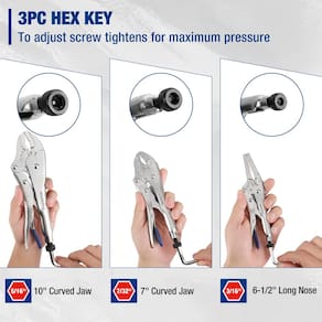 WORKPRO Conjunto de alicates de bloqueio de 3 peças - O conjunto inclui alicates de bloqueio de ponta longa de 17,78 cm e 25,4 cm, alicate de bloqueio de mandíbula curvo, 3 chaves hexagonais. - Design de orifício de chave sextavada: o conjunto está equipado com chaves hexagonais de 3 peças, que podem aumentar e fornecer força máxima de bloqueio. - Parafuso de aperto ajustável e alavanca de liberação rápida: Aplicável para ajustar aberturas de mandíbula adequadas para fornecer a pressão de aperto ideal para diferentes projetos. Capaz de fechar a mandíbula imediatamente para armazenamento. - Durabilidade e resistência máximas: este conjunto de alicates de bloqueio é feito de aço cromo-vanádio de alta qualidade. O aço é tratado termicamente para oferecer a resistência que você precisa e permanece novo em serviço por um período prolongado, independentemente das condições de uso. - Um conjunto é tudo o que você precisa: o conjunto de alicates de bloqueio vem com 3 peças de alicates de tamanhos variados, incluindo alicates de bloqueio de nariz longo e alicates de bloqueio de mandíbula curvos, que podem lidar com a maioria dos requisitos de trabalho.