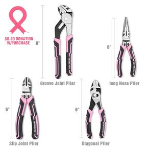 Conjunto de alicates Workpro de 4 peças (fita rosa) - Construído para durar: o conjunto de alicates é feito de aço CR-V e aço CR-NI, e a superfície é tratada termicamente e enegrecida para garantir maior dureza, melhor força de fixação, resistência e durabilidade. A aresta de corte endurecida melhora a conveniência de corte, e o polimento fino aumenta a resistência à corrosão. - Alicate de aplicação multiuso: um conjunto de alicates versátil, perfeito para encanamento, automotivo e aplicações gerais. - Alças ergonômicas e confortáveis: o conjunto de alicates de design elegante e bonito WORKPRO é equipado com alças TPR tri-material, extremamente confortáveis de segurar e usar, facilitando a manobra enquanto você trabalha. - O que você recebe: O conjunto de 4 alicates inclui alicates de ponta longa de 15 cm, alicate diagonal de 15 cm, alicate de junta de ranhura de 20 cm e alicate de junta deslizante de 15 cm. - Fita rosa: A WORKPRO Tools está doando US$ 0,20 desta compra para a National Breast Cancer FOUNDATION, Inc. A NBCF está ajudando mulheres agora, fornecendo serviços de detecção precoce, educação e suporte para pessoas afetadas pelo câncer de mama. De 1º de janeiro de 2024 a 31 de dezembro de 2024, sua compra deste produto resultará em um mínimo de doação ação de US$ 15 .000 para serem doados para Helping Women Now.