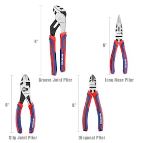 Conjunto de alicates Workpro de 4 peças - Construído para durar: o conjunto de alicates é feito de aço CR-V e aço CR-NI, e a superfície é tratada termicamente e escurecida para garantir maior dureza, melhor força de fixação, tenacidade e durabilidade. A borda de corte endurecida melhora a conveniência de corte, e o polimento fino aumenta a resistência à corrosão. - Alicate de aplicação multiuso: um conjunto de alicates versátil, perfeito para encanamento, aplicações automotivas e gerais. - Alças ergonômicas e confortáveis: o conjunto de alicates de design elegante e bonito da WORKPRO é equipado com alças de borracha termoplástica tripla, extremamente confortável de segurar e usar, facilitando o manuseio enquanto você trabalha. - O que você recebe: o conjunto de 4 peças de alicates inclui alicates de nariz de 15 cm, alicates diagonais de 15 cm, alicates de junção de sulco de 20 cm e alicates de junta deslizante de 15 cm. - Presente ideal: os conjuntos de alicates Workpro de 4 peças são uma ótima adição para qualquer manutenção doméstica ou caixa de ferramentas no trabalho. É um ótimo presente para mecânicos de carros, pais e maridos!