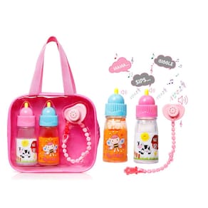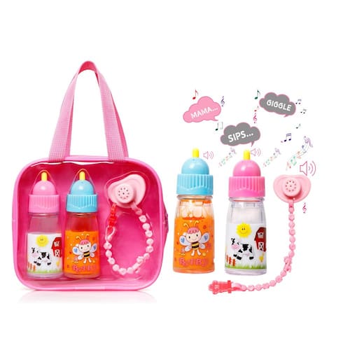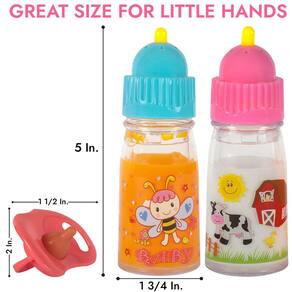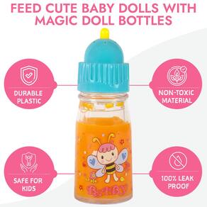 Exquisite Buggy Mamadeiras mágicas My Sweet Baby Disappearing TALKING – Inclui 1 leite, 1 garrafa de suco com chupeta para boneca - NA CAIXA: Você receberá um conjunto de acessórios de boneca, incluindo 2 mamadeiras mágicas - 1 para leite e suco, cada uma com pontas para ranger. Sips and Giggles com 7 sons diferentes com chupeta de boneca Sips and Giggles com cordão e clipe para segurar a boneca. Estas garrafas de plástico leves parecem esvaziar quando a boneca bebe, despertando a imaginação e proporcionando horas de diversão. - Jogo de fantasia realista: Qualidade suprema com durabilidade: projetado com gráficos complexos, este conjunto de cuidados de alimentação de bonecas para meninas é fácil de usar e manter em qualquer lugar da sala de jogos. Seus filhos agora podem desfrutar de sessões interativas de brincadeiras de faz de conta e impulsionar seu pensamento criativo. Os acessórios para bonecas podem ser facilmente enxaguados e armazenados em uma bolsa transparente para brincar - Garrafas mágicas falantes: estas mamadeiras com leite e suco desaparecendo têm um topo que fala que faz um som estridente quando pressionado. Cada garrafa é decorada com lindos gráficos envolventes para entreter mentes jovens. - VÁRIOS ACESSÓRIOS PARA BONECAS DE BEBÊ: Fácil de limpar e transportar: nosso conjunto de brinquedos de alimentação de bonecas possui duas mamadeiras de leite e também garrafas de suco coloridas para melhorar as rodadas imaginativas de brincadeiras de faz-de-conta. Este conjunto de cuidados com o bebê é perfeito para meninas e suas bonecas, já que elas podem carregar a bolsa de brinquedo com elas em seus carrinhos de boneca enquanto vão para o parque ou para o berçário. - Presente ideal para meninas pequenas: se você está procurando a adição perfeita para melhorar as horas criativas do seu filho e melhorar as habilidades cognitivas, este conjunto de alimentação de bonecas foi construído para complementar brincadeiras de faz de conta para meninas. Sua criança pequena pode carregar a bolsa de cuidados com o bebê que pode ser aberta livremente em seu carrinho de bebê, que inclui garrafas de brinquedo para bonecas e uma chupeta de brinquedo.