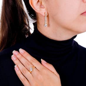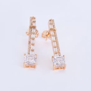 Conjunto de brincos e anel banhados a ouro e com aplicação de baguetes cristais, luxuoso que te deixa em destaque em qualquer situação.