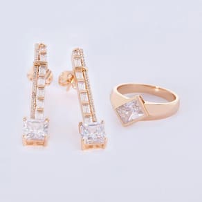 Conjunto de brincos e anel banhados a ouro e com aplicação de baguetes cristais, luxuoso que te deixa em destaque em qualquer situação.