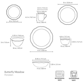 A Lenox é uma marca com mais de 130 anos de história, dedicada a transformar os momentos cotidianos em ocasiões especiais. Comprometida com qualidade, arte e beleza, cada peça é projetada para ser versátil e atemporal. O conjunto de louça Butterfly Meadow apresenta borboletas, libélulas e abelhas zumbindo ao redor de flores vibrantes, em porcelana cerâmica branca durável com bordas elegantes e recortadas.