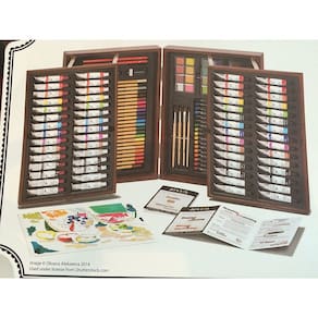 - 30 tintas acrílicas, 15 cores de água, 34 pastéis de óleo fino, 24 lápis de cor, 24 bolos de cor de água, 4 pincéis de tinta e muito mais!