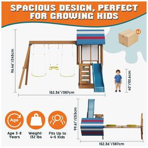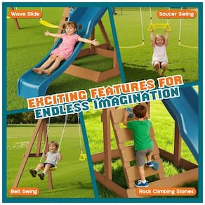 O conjunto de balanço de madeira Albott 6 em 1 oferece uma estrutura robusta em madeira natural com suporte tipo A para garantir estabilidade durante o uso. Possui uma torre com casa para brincar, equipada com um teto tipo tenda colorido que fornece sombra e um espaço de observação para crianças. O escorregador é projetado com formato em onda para proporcionar descidas seguras e suaves. Conta com dois balanços tipo cinto e uma barra trapezoidal, permitindo múltiplas modalidades de balanço simultaneamente. Inclui parede de escalada com apoios manuais para desenvolvimento de habilidades motoras, além de uma escada segura para acesso. O conjunto mede aproximadamente 245 cm de profundidade, 152 cm de largura e 245 cm de altura, ideal para uso em quintais ao ar livre. O produto é feito em madeira durável, adequado para uso externo prolongado.