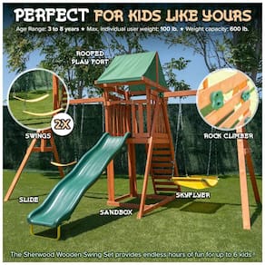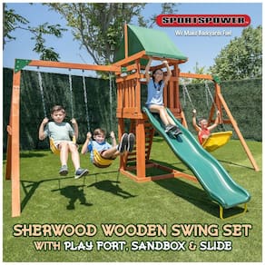 O conjunto de balanços de madeira Sportspower Sherwood é construído com madeira pesada de abeto escandinavo, proveniente de florestas sustentáveis, proporcionando robustez e durabilidade para uso externo. Equipado com 3 balanços ajustáveis em altura, inclui área de caixa de areia, parede de escalada, escorregador de peça única e um deck coberto para atividades variadas. As correntes são revestidas em vinil para prevenir acidentes como beliscões, atendendo e superando as normas ASTM de segurança.