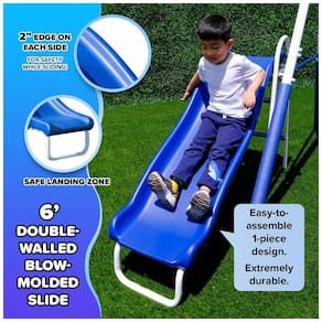 O conjunto de balanços metálico Sportspower Super 9 é fabricado em aço resistente com pintura eletrostática em pó que oferece alta durabilidade e resistência à corrosão para uso externo prolongado. Projetado para suportar até 454 kg distribuídos entre até 10 crianças (cada uma suportando até 45 kg), esse conjunto inclui 9 estações: escorregador de 1,52 m, gangorra para 2 pessoas, balanço duplo de assento clássico, balanço em pé, balanço romano dupla pessoa, barra de trapézio e balanços moldados. Todas as correntes são cobertas com PVC para proteger as mãos das crianças contra beliscões.