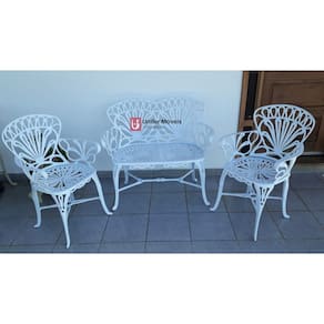 Especificações: 1 Banco de 2 Lugares: 83 cm de altura x 41 cm de profundidade x 95 cm de comprimento. 2 Poltronas: 83 cm de altura x 41 cm de profundidade x 51 cm de largura. Cor: Branco. Material: Alumínio fundido. Tipo de pintura: Eletrostática. Vendemos almofadas separadamente. Requer montagem.