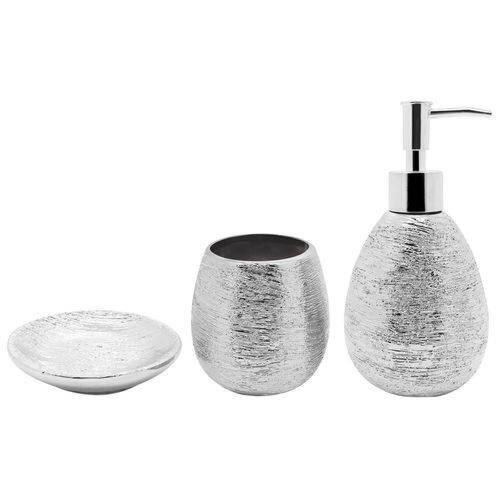 Belo jogo para banheiro modelo Lunar da Mimo composto por 03 peças fabricadas em cerâmica de ótima durabilidade e alta resistência.Ideal para quem preza por qualidade e elegância, o conjunto apresenta design charmoso com acabamento externo todo caracterizado por finas linhas e sofisticada cor prateada. Aposta certa para levar requinte e praticidade ao seu banheiro!
