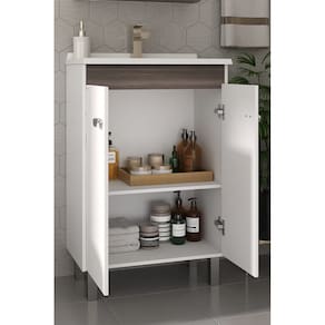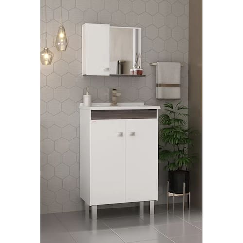O kit econômico com pés é um conjunto de qualidade a um preço acessível, ideal para banheiros compactos. O conjunto é composto por espelho, gabinete e lavatório, e possui uma grande variedade de cores.