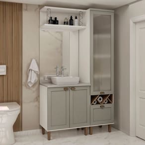 O produto NÃO acompanha cuba nem espelho. Acabamento da Gaveta: BP Acabamento da Porta: BP Acabamento da Prateleira: Pintura Acabamento dos Pés: Pintura Altura dos Pés: 17 cm Ambiente Principal: Banheiro codigo_ean: 7900288263292 Complexidade da Montagem: Alta: deve ser montado por um montador especializado Cor: Branco/Cinza/Cinza Cor do Produto: Branco/Cinza/Cinza Cor Flex: Não Cor Interna: Branco Escala de Brilho: Fosco Escala de Brilho da Gaveta: Fosco Escala de Brilho da Porta: Fosco Escala de Brilho da Prateleira: Fosco Gaveta com Chave: Não Informações Complementares: Conjunto de Banheiro Modulado 100% MDF Americano 3 Peças com Armário de Vidro Itens Inclusos: 1 Conjunto para Banheiro, Kit Ferragens e Manual de Montagem Linha ou Coleção: Iluminata Manual de Montagem e Instalação: https://product-hub-prd.madeiramadeira.com.br/894355760/documents/e5650e1d-94ef-45c4-a263-527c3ea0092c32711847341760364846255.pdf Marca: Genialflex Material da Gaveta: MDF Material da Porta: MDF Material da Prateleira: MDF Material do Puxador da Gaveta: ABS Material do Puxador da Porta: ABS Material dos Pés: ABS Material Principal: MDF Montagem Flex: Não Necessita Montagem: Sim Origem do Produto: Nacional Pés Reguláveis: Sim Peso: 113 kg Peso Máximo por Gaveta: 5 kg Peso Máximo por Prateleira: 5 kg Possui Espelho: Não Possui Pés: 08 Possui Portas: 03 Possui Prateleiras: 04 Possui Rodízio: Não Recomendações de Uso, Manutenção e Limpeza: LIMPAR COM PANO UMEDECIDO E NUMERO DAS PEÇAS RETIRAR COM ALCOOL Sapatas Niveladoras: Não Sistema de Montagem: Parafusos e Cavilhas e minifix Suporta Até (kg): 50 kg Tipo de Corrediça da Gaveta: Metálica Telescópica Tipo de Dobradiça/Corrediça da Porta: Metálica Tipo de Porta: Bater Tipo de Puxador da Gaveta: Externo Tipo de Puxador da Porta: Externo