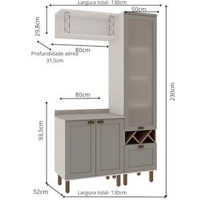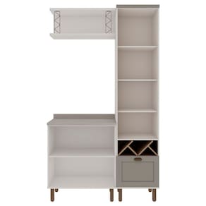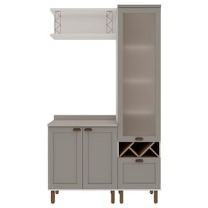 Além do balcão principal, o conjunto inclui um armário com porta de vidro Mini Boreal, molduras refinadas e um gavetão espaçoso.