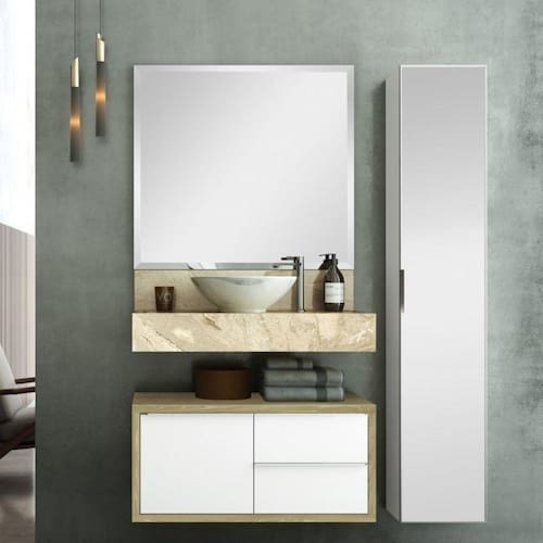 Gabinete fabricado em MDP BP (15 e 25mm), puxadores de alumínio anodizado, gavetas com corrediças telescópicas. Porta com dobradiças slow (35 mm) proporcionam fechamento suave. Espelho Cristal 03 mm com acabamento bisotê, estruturado em painel de MDF. CUBA redonda de apoio em louça brilhante. Armario vertical fabricado em MDP BP (15mm e 18mm), puxador de alumínio anodizado, porta com dobradiças grandes (35mm) e prateleiras com suportes de aço, porta espelhada para o corpo inteiro, espelho com película de proteção emoldurado em reforçado perfil de alumínio. Bancada para Banheiro é fabricada em porcelanato técnico polido, acompanha frontão frontal e frontão lateral. Ideal para compor com os gabinetes Pró 80 da marca Bumi Móveis * Não acompanha torneiras e acessórios. Ambiente: null Ambiente Principal: Banheiro Cor: Travertino Cor Predominante: Bege Informação Complementar: 1x Espelho para Banheiro 80x80cm Acabamento em Bisotê Blu Espelhado Largura: 80 cm Altura: 80 cm Peso: 9,6 kg Profundidade: 1,2 cm Necessita Montagem: Não