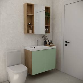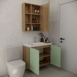 MDF 18cm, Lamina de borda em PVC, Puxador de metal, Dobradiça com amortecimento, MDF e Espelho (porta), MDF (prateleira)Vendido e entregue por MadeiraMadeira