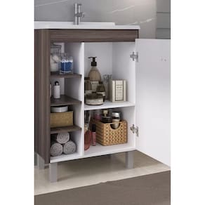 O Kit Sophia possui gabinete com pés com estrutura amadeirada, podendo escolher entre 3 opções de cores, portinha ampla e nichos laterais onde os objetos de uso cotidiano podem ajudar a compor a decoração. Acompanha lavatório Soft em mármore sintético com capacidade de 6 litros e uma espelheira com espelho amplo e portinha lateral com prateleira interna oferecendo espaço adicional para guardar itens menores . Um conjunto lindo para manter toda organização e praticidade que você e sua família merecem!