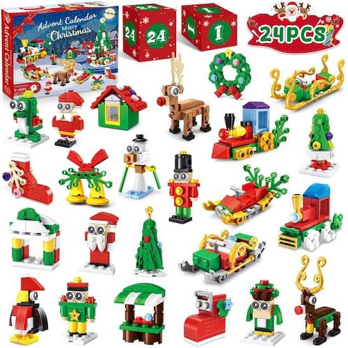 Conjunto de blocos de construção do Calendário do Advento 2024, 604 peças, calendário de contagem regressiva surpresa de 24 dias, kit de construção, árvore de Natal, trem de renas, trenó, trenó, presentes para crianças, meninos e meninas