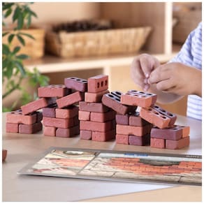O kit inclui 60 tijolinhos do mesmo formato, em tons de vermelho, pensados para que as crianças pratiquem empilhamento, criação de muros, fachadas e maquetes, além de apoiar atividades de stop motion e construção de cenários. As 10 cartas de conceito dupla face fornecem propostas de estruturas e desafios que trabalham escala, simetria, equilíbrio, raciocínio espacial e noções iniciais de engenharia em contextos domésticos e escolares.?