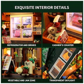 O design interativo inclui portas frontais e laterais articuladas, porta da geladeira funcional e teto traseiro removível para acesso interno. O carrinho externo permite troca de flores por frutas, vegetais ou plantas, ampliando configurações modulares. Inclui três minifiguras e um cão para composição de cenas.