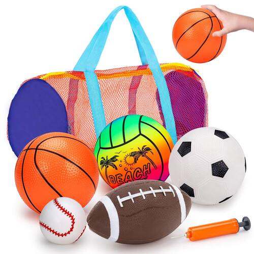 -?CONJUNTO DE BOLAS ESPORTIVAS SUPER VALUE?Nossa variedade de conjuntos inclui futebol, basquete, futebol, beisebol e voleibol com bolsa de armazenamento e bomba manual. A bola elástica salta, ótima, com textura real e macia, tamanho adequado, incentiva crianças de 1 a 3 anos a se agarrarem e explorarem com facilidade, desenvolve habilidades motoras e a coordenação, brinquedos esportivos ideais para iniciantes de 1 a 3 anos, ajuda as crianças a reconhecer e aprender diferentes esportes com bola. Desfrute de uma variedade de jogos sem precisar comprar brinquedos de bola duplicados!