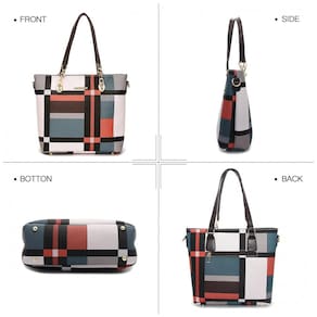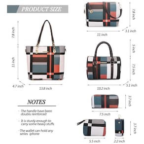 Dimensões do conjunto de bolsas bolsa grande 35,05 centímetros x 12,7 centímetros x 27,94 centímetros A bolsa Boston 25,4 centímetros x 12,7 centímetros x 19,05 centímetros A bolsa de corpo 27,94 centímetros x 10,92 centímetros x 19,81 centímetros Bolsa de mão 13,97 centímetros x 10, bolsa de cartão 6,86 centímetros x 10,92 centímetros