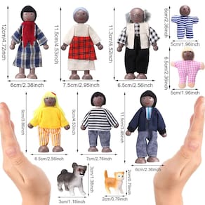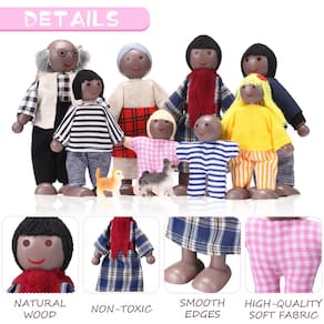 Características: durável, estimula a imaginação e a criatividade bonecas brinquedo, madeira, dramatização, presentes para meninos e meninas Desenvolver habilidades: Este conjunto de figuras de madeira pode cultivar o desenvolvimento abrangente da linguagem, pensamento e imaginação, habilidade prática, cognição social e habilidades de comunicação interpessoal. É um brinquedo educativo prático para estimular a imaginação e a criatividade, que pode ser aplicado como presente de aniversário ou presente de feriado. Especificações: Cor: como mostrado nas imagens. Material: madeira, tecido. Tamanho: Tamanho da avó: 11,5 x 7,5 /11,5 x 7,5 cm (aproximadamente). Tamanho do avô: 11,3 x 6,5 cm (aproximadamente). Tamanho da mãe: 12 x 6 cm (aproximadamente). Tamanho do pai: 11,5 x 7 cm/4,53 x 2,76 polegadas (aproximadamente). Tamanho da irmã: 9,8 x 6,5 cm/3,86 x 2,56 polegadas (aproximadamente). Tamanho Brother: 8,8 x 6 cm/3,46 x 2,36 polegadas (aproximadamente). Tamanho do gato: 2 x 2 cm/0,79 x 0,79 polegadas (aproximadamente). Tamanho do cachorro: 3 x 3 cm/1,18 x 1,18 polegadas (aproximadamente). A embalagem inclui: 1 boneca vovô. 1 boneca da avó 1 boneca papai. 1 boneca Mom 1 boneca Brother. 1 boneca irmã mais nova. 1 boneca Sister 1 boneca. 1 boneca de gato. 1 boneca de cachorro. Observações: Recomendado para pessoas menores de 16 anos. Considere uma pequena diferença no tamanho devido à medição manual. Considere pequenas diferenças de cor devido a diferentes monitores e efeitos de luz. - Qualidade confiável: este conjunto familiar de casa de bonecas de madeira é feito de madeira de qualidade com bordas lisas, pintado com pigmentos não tóxicos, cada fantoche é polido à mão sem rebarbas para proteger os jogadores de arranhões, adequado para seus pequenos brincarem e colecionarem - Conjunto de brinquedos para a família de bonecas: o pacote inclui avós, pais, 3 filhos, um bebê, um gato e um cachorro, realmente restaura as cenas da vida familiar, adicionando calor e cores à decoração da casa - Membros flexíveis: estes mini bonecos familiares de madeira apresentam mãos e pés móveis, permitindo que você os coloque em diferentes posturas como quiser, como sentado, em pé, dobrado - Design adorável: as figuras de pessoas de casa de bonecas de madeira são vestidas com roupas macias com um toque confortável, projetadas com um sorriso doce no rosto, fofas e divertidas o suficiente para chamar a atenção das pessoas e conquistar seus corações - Desenvolver habilidades: este conjunto de figuras de madeira pode cultivar o desenvolvimento abrangente da linguagem, pensamento e imaginação, habilidade prática, cognição social e habilidades de comunicação interpessoal; é um brinquedo educativo prático para estimular a imaginação e a criatividade, que pode ser aplicado como presente de aniversário ou presente de feriado