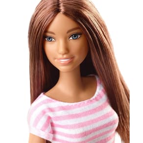 - Barbie A boneca fica casual e legal em um vestido com blusa listrada rosa e branca e saia jeans; os tênis brancos completam a roupa versátil.