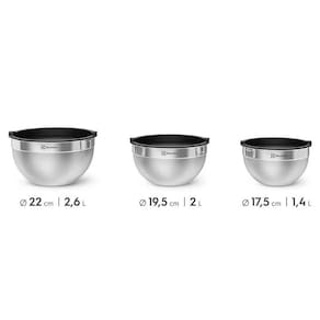 Conjunto de Bowls Electrolux de Inox. Estilo na hora de preparar, servir e conservar os alimentos. Um conjunto completo, pensado para levar ainda mais facilidade, conveniência e beleza para a sua cozinha. Perfeito na hora de usar Conjunto formado por três bowls de aço inoxidável com tampa plástica para preparar servir e conservar alimentos na geladeira. Indicado para diferentes preparos com 3 tamanhos, atendem as mais variadas necessidades, como temperar carnes, fazer massas, servir saladas e preparar molhos. Durabilidade, praticidade e estilo Feitos de aço inoxidável, são mais duráveis e o acabamento polido facilita a limpeza. Perfeitos para preparar e servir, além de decorar a mesa. Multiuso Este produto pode ser utilizado no refrigerador e lavado na lava-louças. Informações técnicas: Ø 17,5cm | 1,4 L Ø 19,5 cm| 2 L Ø 22 cm| 2,6 L