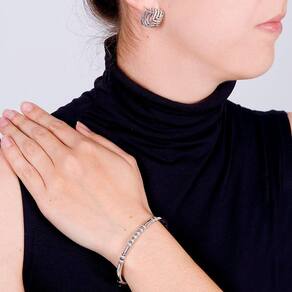 Conjunto de bracelete e brincos em ródio branco com aplicação de zircônias cristais é luxuoso e que te deixa em destaque em qualquer situação.