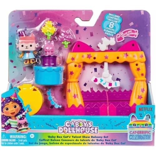 Descrição: Crie brincadeiras sem fim com os conjuntos de varanda para festa: Smoothie de frutas da Cakey Cat , Show de Talentos da Baby Box Cat e Vigia Sonhador do Pandy Paws (vendidos separadamente). Coloque cada boneco e móveis da casa de bonecas na varanda para uma celebração Cat-errific! Cada varanda pode ser fixada nas janelas externas da Casa de Bonecas da Gabby (Código 3063 | Vendida separadamente) e inclui uma figura e acessórios . O conjunto conta com uma caixinha surpresa. Abra a caixinha, assim como Gabby faz na série, para descobrir o acessório misterioso.