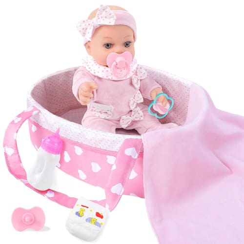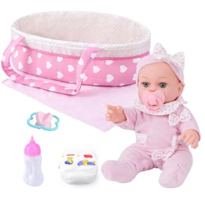 Conjunto de bonecas de 30 cm com roupas e acessórios para bonecas para crianças a partir de 3 anos. Inclui cama de berço, cobertor, mamadeiras, mamilos, fraldas, brinquedos - O pacote inclui: boneca e roupas de bebê de 30 cm, cama de berço, cobertor, mamadeiras, mamilo, fralda, brinquedos - Parece real: os olhos da boneca têm uma aparência realista. A cabeça e os membros da boneca infantil realista podem ser girados, e a boneca bebê pode sentar e deitar. As roupas de boneca são removíveis e laváveis. - O presente perfeito: vem embalado pronto para uso ou para entregar como o presente perfeito para o Natal, feriados, aniversários ou qualquer outro momento. - Seguro premium: sem fragrância, lavável, macio e suave, adequado para crianças e ecológico. Se a boneca ficar suja, limpe-a com um pano úmido e ficará como nova. - Garantia de serviço: prestaremos atenção à sua experiência de compra. Se você tiver alguma dúvida ou sugestão sobre os produtos que recebe, a tempo e resolveremos o problema para você.