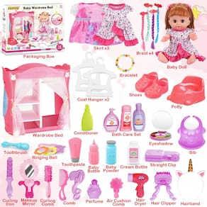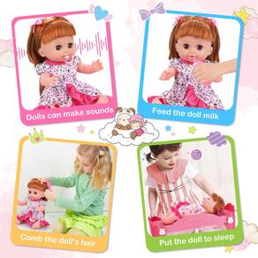 Conjunto de brinquedo de boneca de 35,5 cm com cama de guarda-roupa, conjunto de 37 peças de beleza para cuidados com o cabelo e a boneca, brinquedo infantil de brincar, incluindo kit de salão de beleza, roupas de boneca, presente de bebê para meninas de 3 4 e 5 6 anos ou mais - Conjunto de brinquedos My First Toddler Doll Toys: Nosso conjunto de bonecas é perfeito para os pequenos que são novos no cabeleireiro e adoram se vestir de arrasto. Ele manterá suas princesinhas ocupadas por horas! Aprenda enquanto brinca e apresente-os ao mundo do cuidado e do amor. Realista e completo com acessórios, facilitando para as crianças segurarem, abraçarem e carregarem - Conjunto de 37 peças de boneca com vestiário: um acessório de cuidados e cuidados com bebês de ótimo valor, totalmente trabalhado e realista. O conjunto inclui um bebê realista, vestiário, conjunto de roupas de boneca, modelador de cachos, ferro de alisar, secador de cabelo, espelho de maquiagem, óleo de cabelo, tranças de cabelo, pentes variados e outros itens ariosos de cabelo e cuidados - Brincadeira interativa: as crianças podem praticar fazer todos os tipos de penteados bonitos e cuidar de seus bebês. Incentiva a sustentação, o cuidado especial e permite que os pequenos interpretem como se cuidassem de um bebê de verdade para melhorar as habilidades sociais e de desenvolvimento das crianças durante brincadeiras de faz-de-conta. Uma ótima maneira de incentivar as crianças a usarem sua imaginação e criatividade - Material amigável e seguro: todos os acessórios de boneca são feitos de materiais seguros, duráveis e não tóxicos, garantindo que sejam seguros para as crianças brincarem. Este brinquedo de boneca fará 12 tipos de sons, sua princesinha aproveitará o momento feliz de encenações entre pais e filhos - Presente de brinquedos infantis para crianças de 3, 4, 5 e 6 anos ou mais: nosso conjunto de brinquedos para bebês é perfeito para qualquer criança que adora brincar com bonecas e se envolver em brincadeiras imaginativas. Também é uma opção criativa de presente de Natal para Natal, feriados, aniversários ou qualquer outro momento