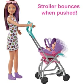 - Este conjunto de brinquedos Skipper Babysitters Inc. apresenta uma boneca de babá Skipper, uma boneca e um carrinho de bebê que pula para cima e para baixo ao ser empurrado.