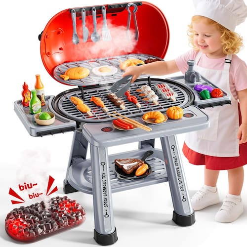 - Experiência realista de churrasco - O conjunto de brinquedos de churrasco fingido apresenta sons realistas de fogo, luzes cintilantes e efeito de fumaça que imita uma churrasqueira real. As crianças podem fingir que preparam refeições deliciosas como um verdadeiro churrasco. Além disso, uma pia para lavar vegetais também foi cuidadosamente projetada, o que é um ótimo brinquedo de cozinha para entretenimento interno e externo.
