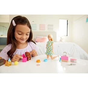 A boneca Barbie está dando uma festa para seus filhotes de estimação, e jovens imaginações são convidadas a participar da diversão! Vista cada cachorrinho em seu chapéu de festa festivo, em seguida, ajude a boneca Barbie a encher o molde do bolo com uma ou ambas as cores de massa incluída. Pressione a alavanca para vê-la 'subir' e revele um bolo adorável em forma de osso! As crianças podem decorar as guloseimas com toppers de bolo incluídos e servi-las aos filhotes de estimação da boneca Barbie em tigelas de cachorro coloridas. Uma caixa de presente esconde uma bola para seus filhotes dentro, e o cachorrinho maior pode 'mastigar' quando as crianças pressionam sua cauda! Com tantas características doces, este playset de festa de cachorrinho barbie faz um grande presente para crianças de 3 a 7 anos de idade. A boneca não pode ficar sozinha. Cores e decorações podem variar.