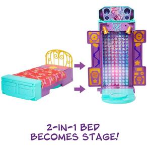 Mattel Conjunto de brinquedo Karma's World com boneca e acessórios, conjunto de palco de estrela musical transformadora com luzes e sons, cama 2 em 1 para palco - Os fãs do Karma's World podem ajudar a boneca Karma a tornar seus sonhos de estrela do rap realidade com este conjunto de brinquedo 2 em 1 do palco musical que se transforma - O conjunto de quarto se transforma em um palco com luzes e sons para que a boneca Karma (22 cm) possa fingir que sua cama é um palco, assim como no show. - Discos pop (5 incluídos) nos toca-discos para reproduzir clipes de música que os fãs podem fazer rap. - DJ Booth também tem efeitos sonoros para que as crianças possam "arranhar" os clipes de música para personalizar suas faixas. - Com acessórios menores, como chinelos, um pente e seu animal de estimação Major, a boneca Karma tem tudo o que ela precisa para chutar no quarto ou realizar o show dos seus sonhos. - Colecione mais discos (vendidos separadamente) de outras bonecas e conjuntos de brinquedos Karma's World para desbloquear mais batidas para tocar neste conjunto. - Ótimo brinquedo para crianças e fãs a partir de 3 anos de idade.