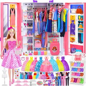 - Roupas e acessórios de boneca para meninas: o pacote inclui 1 boneca, vestidos de princesa, vestidos modernos, calça, macacão, biquíni, maiôs, guarda-roupa, sapateira, pulseira, estojo, chapéu, óculos, bolsa, clipes de cabelo, adesivo de cachos de cabelo, espelho, pente, cabides, sapatos e muito mais. Adequado para bonecas de 11,5".