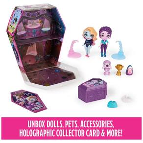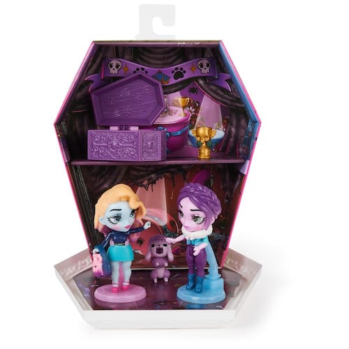 Conjunto de luxo Zombaes Forever, Wild Vibes, Rest in Show Zombie Dolls & Accessories, 2 bonecos exclusivos de 3,5 polegadas, 2 animais de estimação e muito mais, brinquedos infantis para meninas — 2 bonecos colecionáveis exclusivos: descubra 2 brinquedos exclusivos para meninas Zombaes Forever, um caixão de brinquedo, 2 animais de estimação, 2 acessórios para bonecas, 2 suportes e um cartão colecionador holográfico! Cada boneca de 3,5 polegadas está pronta para a exposição de cães! - SURPRISE PET UN-COFFIN-ING: Abra o caixão e encontre um animal de estimação para adicionar à sua bonequinha, finge brincar, contando histórias — ele se prende aos braços da boneca! Também inclui uma bolsa para cães, coleira de boneca e um troféu. - CONJUNTO DE BRINQUEDOS STORY IN A BOX DOLL: A caixa de caixão reutilizável se transforma em um conjunto de brinquedos, perfeito para contar a história caótica da exposição canina Zombaes Forever! Ótimo presente para amantes de cães! - MIX N' MATCH LOOKS: troque os animais de estimação e o cabelo de cada boneca zumbi entre si ou com qualquer uma das outras bonecas Zombaes Forever para meninas! Levante seus cabelos para encontrar designs surpreendentes em seus cérebros brilhantes! - Brinquedos surpresa para meninas de 4 anos ou mais: essas bonecas e acessórios zumbis são ótimos presentes de aniversário, meias e presentes de Natal para crianças! Brinquedos de Halloween perfeitos para o Dia de los Muertos (Dia dos Mortos)! - Inclui: 2 bonecos Zombaes Forever, 2 animais de estimação Zombaes Forever, 2 acessórios, 1 caixão para animais de estimação, 1 espaço de jogo, 2 suportes para bonecas, 1 carta colecionável, 1 lençol colecionável — coberto pelo compromisso da Spin Master Care. Veja abaixo os detalhes completos