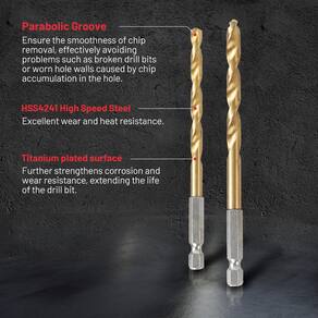 Compatível com chaves de fenda elétricas, chaves de impacto e outras ferramentas que podem usar hastes hexagonais de 6 mm. Pode ser utilizado para perfurar aço, cobre, alumínio, liga de zinco, ferro fundido, madeira, placa de fibra, placa de plástico, especialmente adequado para perfuração de placas finas. - ?Tamanhos completos?O conjunto de brocas de impacto inclui os 15 tamanhos mais utilizados (2 peças x 1/40.6 cm, 5/162.6 cm, 3/81.3 cm, 7/162.6 cm, 2 peças x 1/20.3 cm, 9/162.6 cm, 5/81.3 cm, 2 peças x 3/40.6 cm. cm, 7/81 3 cm, 1/10.2 cm, 5/40.6 cm, 3/20.3 cm), e também vem com uma caixa de armazenamento de plástico grosso, que pode atender perfeitamente às suas necessidades de trabalho. - ?Design de ângulo superior de 135°?Em comparação com a broca de torção de ângulo superior de 118°, o design de ângulo superior de 135° é mais propício à quebra de cavacos, o que reduz os problemas causados pelo emaranhamento excessivo de cavacos na broca ou furo e também evita efetivamente que a broca oscile e desvie, o que torna a broca cortada mais suavemente e melhora a precisão da perfuração y. - ?Ranhura parabólica?O sulco parabólico garante a suavidade da remoção de cavacos, evitando efetivamente o acúmulo de lascas no orifício e levando a problemas como brocas quebradas ou desgaste da parede do furo, etc. ; a parte traseira da ranhura parabólica tem uma grande lacuna, de modo que o refrigerante lubrificante possa penetrar na broca para resfriar totalmente e lubrificar a aresta de corte, reduzir o desgaste e o calor e melhorar a durabilidade e a eficiência da usinagem. - ?Revestimento de titânio HSS?As brocas HSS4241 têm excelente resistência ao desgaste e ao calor e podem lidar facilmente com ambientes de alta temperatura, o que é muito adequado para operações de perfuração de alta intensidade. O revestimento de titânio na superfície reduz o atrito durante o processo de perfuração e fortalece ainda mais a resistência à corrosão e ao desgaste, prolongando a vida útil da broca. O revestimento de titânio também inibe a geração de calor durante o corte, o que melhora significativamente a eficiência da usinagem. - ?Modelos compatíveis e materiais aplicáveis?Compatível com chaves de fenda elétricas, chaves de impacto e outras ferramentas que podem usar hastes hexagonais de 6 mm. Pode ser utilizado para perfurar aço, cobre, alumínio, liga de zinco, ferro fundido, madeira, placa de fibra, placa de plástico, especialmente adequado para perfuração de placas finas.