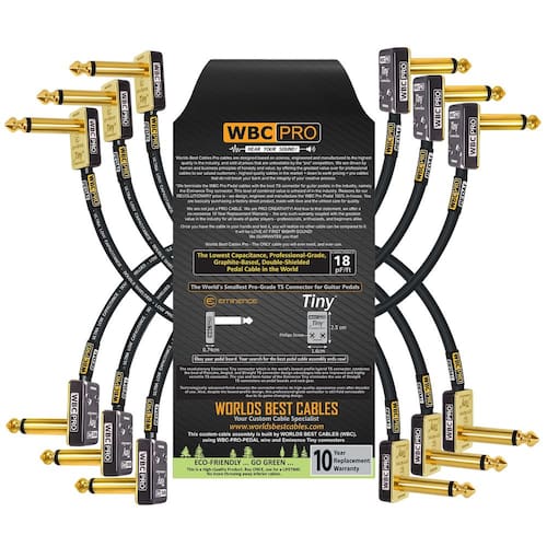 + + SUA BUSCA PELO MELHOR CONJUNTO DE CABOS DE PEDAL TERMINA AQUI + + Este é um conjunto de cabos, feito pela WORLDS BEST CABLES (WBC). Este conjunto de cabos é feito com fio WBC-PRO-PEDAL, fio ultraflexível, de baixa capacitância (18 pF/ft), blindagem dupla (cobertura de alta densidade de 98%, proteção de fio de cobre sem oxigênio e camada de PVC condutor à base de grafite) e Eminence Tiny, o menor conector TS premium banhado a ouro de 1/4 de polegada do mundo. Nós da WBC sempre fabricamos conjuntos de cabos personalizados de classe mundial usando muitas das principais marcas de cabos e conectores. Se você não conseguir encontrar o comprimento e o tipo de cabo que está procurando, sinta-se à vontade para entrar em contato conosco, faremos o possível para montar o cabo necessário para você. IMPORTANTE, ATENÇÃO: O comprimento do cabo é medido de ponta a ponta de cada conector, esse é o padrão da indústria para medir cabos de conexão (os detalhes da medição estão claramente representados em uma das imagens na galeria de imagens para esclarecer ainda mais o processo de medição. Há muitas imagens na galeria, clique na imagem principal para abrir a galeria completa). Esta é uma montagem em que você não precisa se preocupar com o tamanho do plugue. O Eminence Tiny pode até mesmo ser utilizado como conector reto na maioria dos jackfields + + MUDE PARA EMINENCE TINY, O NOVO PADRÃO GLOBAL + +