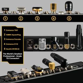 - O revolucionário Tiny Connector da Eminence, o plugue TS híbrido de menor perfil do mundo, combina tudo de bom nos plugues Pancake TS, Angled TS e Straight TS. Devido ao tamanho extremamente pequeno, isso eliminará a necessidade de usar plugues TS retos na maioria dos equipamentos de pedal e rack. O acabamento tecnologicamente avançado garante que o plugue mantenha sua aparência de alta qualidade mesmo após décadas de uso. Apesar do design fino, este plugue de nível profissional ainda pode ser reparado em campo devido ao seu design revolucionário.