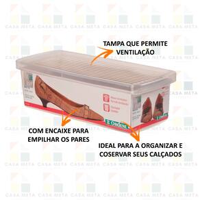CONJUNTO CAIXA P/ SAPATOS PEQUENA - LEVE 6 PAGUE 5A Caixa para Sapatos Ordene é ideal para organizar e conservar seu calçado, pois possui tampa que permite a ventilação. Com elas você ganhara espaço empilhando os pares, protegendo seus sapatos e facilitando sua identificação na hora de usar. O tamanho P é ideal para organizar calçados da numeração 28 às 34.Características:- Medida de cada caixa: 11 x 15 x 36 cm (A x L x P).- Capacidade em peso: 5kg- Material: Plástico.- Permite ventilação, possibilitando o armazenamento dos sapatos por longos períodos sem danos causados pelo tempo.- Empilhável, economizando espaço e tornando o ambiente mais funcional.- Transparente, permitindo a identificação do sapato que está dentro. Vantagens do Kit Caixa de Sapato Leve 6 Pague 5 Transparente P 11x15x36cm Ordene- Economiza espaço no local;- Melhora a organização;- Ajuda na conservação dos calçados;- Você leva seis caixas e paga cinco.Importante:Nunca armazenar seus sapatos úmidos ou molhados, pois esta atitude favorecerá o desenvolvimento de odores desagradáveis e encurtará a vida útil do mesmo.