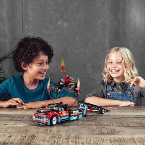 - O conjunto 2 em 1 apresenta um caminhão com reboque e uma motocicleta acrobática, ambos com motor de tração, que se reconstrói em um monster truck e uma rampa de acrobacias