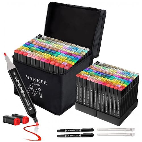 120 CORES VIBRANTESCanetas marcadoras de arte exclusivas de 120 cores dão vida à sua arte, múltiplas opções, cores padrão na caneta, sistema de cores, sem desvio, transição natural, sobreposição de cores naturais, efeito excelente, cores brilhantes, fáceis de misturar. Quer seja um livro para colorir ou uma obra prima em construção, seu trabalho artístico certamente brilhará com esses marcadores de pincel. Ótimo como marcadores de arte, marcadores de esboço, marcadores permanentes, marcadores à base de álcool, marcadores de tinta.