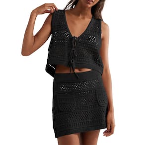 Tão atemporal e perfeito para dias de praia, este lindo conjunto da nossa coleção de saída de praia de crochê será um item ideal para todas as estações. Mantenha-o coordenado com um conjunto que é perfeito para misturar e combinar. Ajuste relaxado inspirado no colete, decote em V, fechos de gravata na frente, sem forro. A minissaia possui cintura elástica de cintura alta para facilitar o puxão, bolsos caídos - Essenciais: Descubra nossa variedade de saídas de banho femininas, com minissaia de cintura alta, como roupa de praia com costura vazada. A gravata frontal é projetada para ser fácil de colocar e tirar. O conjunto de saída de praia se tornará sua roupa de praia favorita - Design exclusivo: a saída de praia de crochê de 2 peças apresenta malha boho leve, gola V, fecho frontal de amarrar, adicionando um toque de gosto feminino. Nossas saídas de praia femininas não são apenas um conjunto de roupas, são tendências da moda e malhas funcionais - LEVE: Tecidos macios e respiráveis com designs transparentes adicionam um toque sexy ao seu visual de verão. Revelador, mas modesto, nossa saída de banho pode fornecer cobertura enquanto ainda exibe roupas por baixo. Este top curto sem mangas para mulheres não só pode ser utilizado como saída de praia, mas também pode ser utilizado como uma regata de malha leve de verão - OCASIÃO: Nossos conjuntos de saias de praia femininas de 2 peças são uma combinação de tops sem mangas e mini vestido quente, perfeito para férias na praia. A saída de praia feminina é uma adição definitiva à sua coleção de roupas de banho. Adequado tanto para uso casual, como festas, regresso a casa, sair, praia, férias, viagens, namoro - DICAS QUENTES: Para uso duradouro, recomendamos lavar à mão em água fria, secar na horizontal e evitar alvejante. Basta seguir nossas instruções de cuidados e você poderá usá-lo por muitos anos