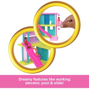 - Cada casa da Barbie é projetada com pequenos luxos que incluem um elevador funcional, escorregador e piscina, assim como a Dreamhouse em tamanho real!