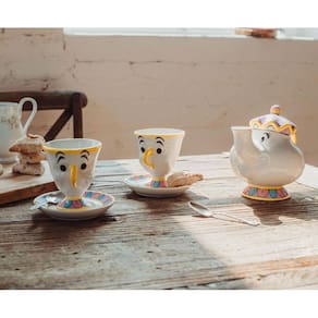 - Um convidado bem-vindo no castelo: o conjunto de chá esculpido apresenta a personagem clássica Sra. Potts com duas xícaras e pires. Basta adicionar o seu chá favorito neste bule clássico para preparar uma bebida das coisas boas.