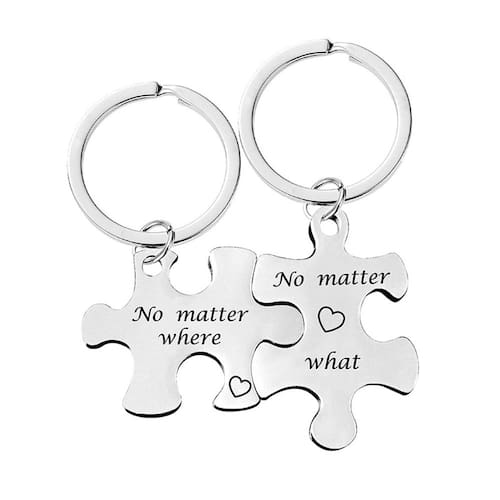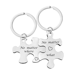 Material: metal Tamanho: 2,5* 5 cm Peso: 20 g Design significativo do quebra-cabeça: este conjunto de chaveiros para casais apresenta duas peças de quebra-cabeça entrelaçadas, simbolizando a conexão entre os parceiros com a frase gravada “Não importa onde, não importa o que aconteça” e um símbolo de coração. Aço inoxidável premium: feitos de aço inoxidável de alta qualidade, esses chaveiros são duráveis, resistentes à ferrugem e feitos para durar, tornando-os ideais para o uso diário e um lembrete duradouro de seu vínculo. Gravação personalizada: os chaveiros são gravados com uma mensagem sentimental, tornando-os uma lembrança especial e atenciosa para casais, amigos ou qualquer pessoa que valorize uma conexão significativa. Perfeito para casais: ideal para parceiros, este conjunto de chaveiros combinando serve como um acessório fofo e prático para casais que desejam carregar um pedaço de seu amor aonde quer que estejam. Compactos e leves: medindo 2,5 x 5 cm e pesando apenas 20 g, esses chaveiros são leves e fáceis de transportar, o que os torna uma adição conveniente a qualquer bolsa, chaveiro ou coleção de acessórios.