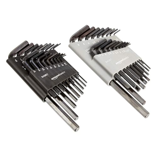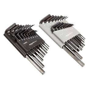 Amazon Basics Conjunto de chaves Allen Wrench/hexagonal, tamanhos SAE e métrico, aço cromo vanádio, 2 suportes organizados, conjunto de 36 peças - Chaves Allen (também conhecidas como chaves hexagonais) para apertar ou soltar parafusos - Inclui 36 chaves hexagonais em tamanhos SAE e métricos e com comprimentos de braço longos e curtos - Feito de aço cromo-vanádio durável com um acabamento de óxido preto para resistência robusta e resistência à ferrugem - 2 capas articuladas incluídas, completas com compartimentos dedicados para armazenamento de chaves e marcações de tamanho claras para localização rápida - Ideal para trabalhar em bicicletas, motocicletas, veículos, móveis, máquinas e muito mais - Dimensões do produto: 18,8 x 8,6 x 4,2 cm (CxLxA)