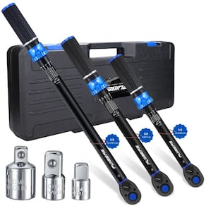 Chave de torque de alto torque 3/4 polegadas 61 a 305 m, chave de torque PUIBERS 3/4 para carro, caminhão, trator, precisão ± 3% chave de torque ajustável em duas direções com 48 dentes de precisão - 1. Conjunto prático de chaves de torque: este conjunto de chaves de torque de 1/2 3/8 1/4 inclui três chaves com especificações de 1/2 '' 10-170 FT.LB, 3/8'' 5-50 FT.LB, e 1/4'' 20-240 lbf.in. Além disso, fornecemos três adaptadores: adaptador de soquete de 1/10.2 cm a 3/20.3 cm, adaptador de soquete de 3/20.3 cm a 1/5.1 cm e adaptador de soquete de 1/5.1 cm a 3/20.3 cm. - 2. Estável e confortável: este conjunto de chaves de torque é feito de aço cromo-vanádio durável com escalas duplas claras e fáceis de ler. A alça possui um design listrado antiderrapante para melhor aderência e escalas não reflexivas que garantem a legibilidade em todas as condições de iluminação. - 3. Fácil de usar: nossa chave de torque é simples e intuitiva de operar. Puxe o botão de bloqueio para baixo e segure-o até que o torque desejado seja definido. Solte o botão e ele se encaixará automaticamente para bloquear o valor. Quando o valor de torque predefinido for atingido, uma vibração tátil na alça ou um "clique" audível alertará você para parar de aplicar força. - 4. A chave de torque possui uma catraca de liberação rápida de 72 dentes para facilitar a inserção e remoção dos soquetes, e segura o soquete com segurança para evitar escorregões. A alavanca das chaves de torque pode ser ajustada na direção de uso, permitindo a operação no sentido horário e anti-horário, proporcionando maior flexibilidade e conforto. - 5. Aplicações versáteis: este conjunto de chaves de torque é amplamente aplicável a porcas e parafusos em várias configurações, adequado para instalação na máquina, bem como chave de torque para manutenção de bicicletas, carros, caminhões, tratores.